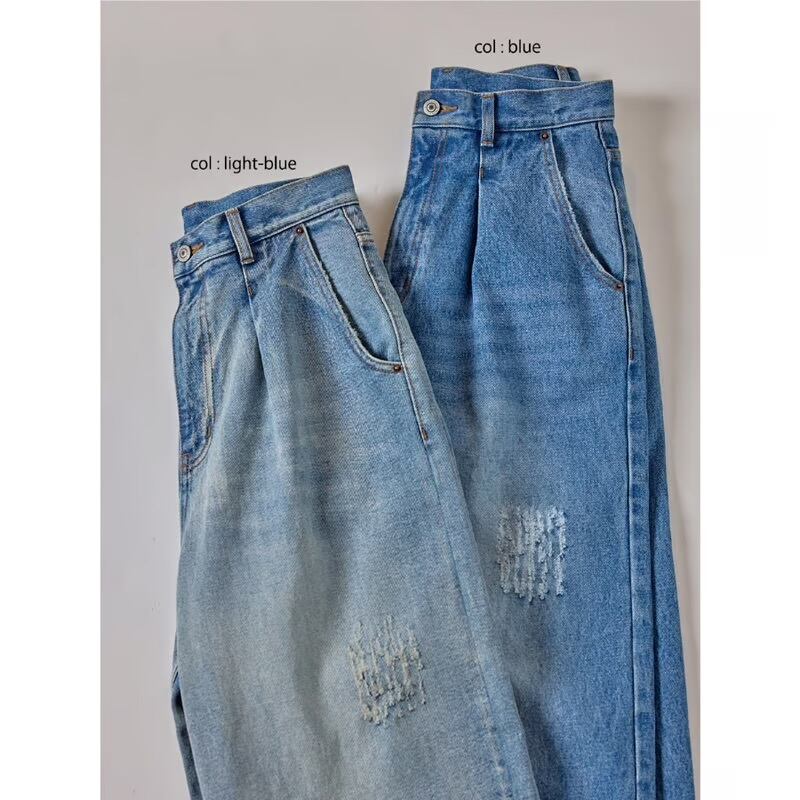 膝下にいれた切り替えデザインや、ところどことに施したさりげないダメージ加工など、こだわりのつまった1枚です。
