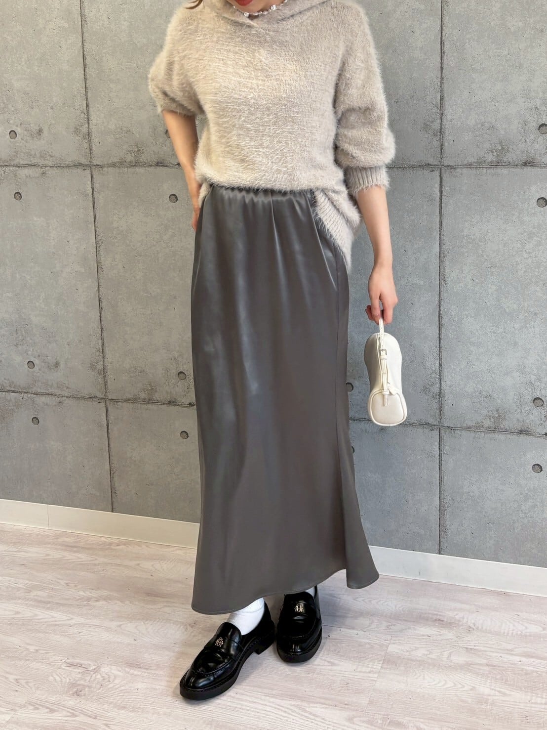 上品なマットな質感が魅力のサテンスカート。ややフレアシルエットで動きが出るため、自然と細見え効果を演出します。軽やかな素材感で、秋冬のニットとの相性も抜群です。