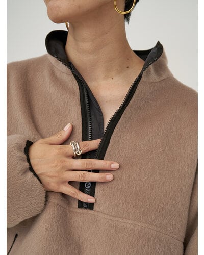 アウトドア製品にあるようなハーフジップのアウターをタウン仕様に落とし込みました。定番のファーやボアではなく