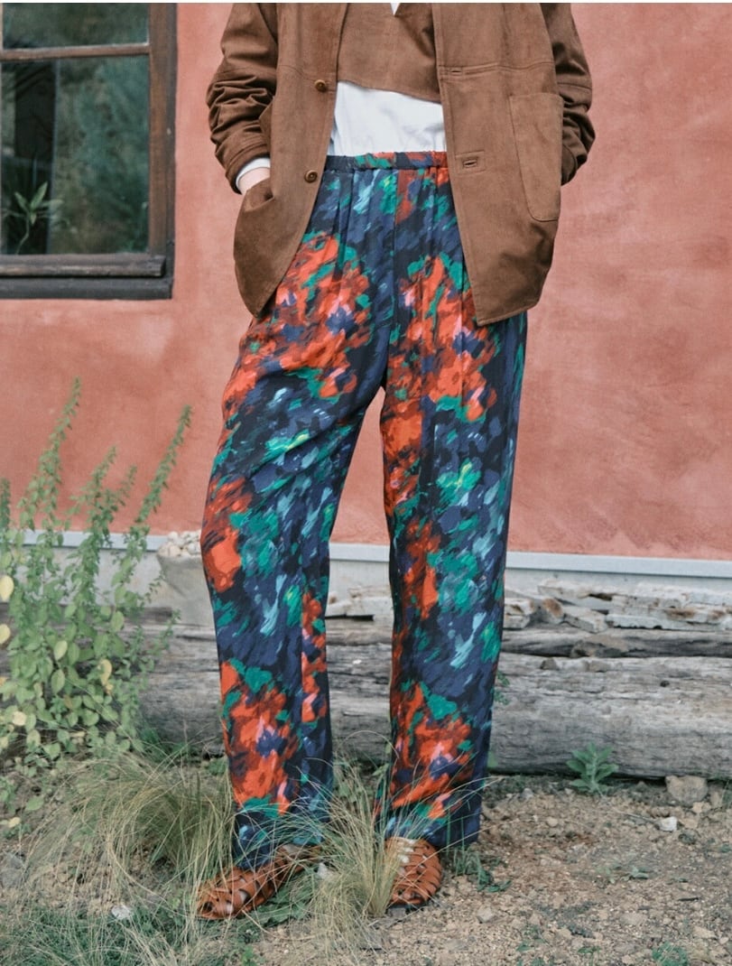 創業100年以上のトルコの老舗生地メーカーIPEKER社のプリント生地。 プリント加工の難しいRY/CUのP下でも、安定した品質を保てる高い技術力で定評あり。 パウダリーでとろみのある素材感に合う、タック入りで適度なゆとりのある、ウエストゴムのイージーパンツ。ラインを拾いにくくする為わたり下まで落ち感のある裏地付き