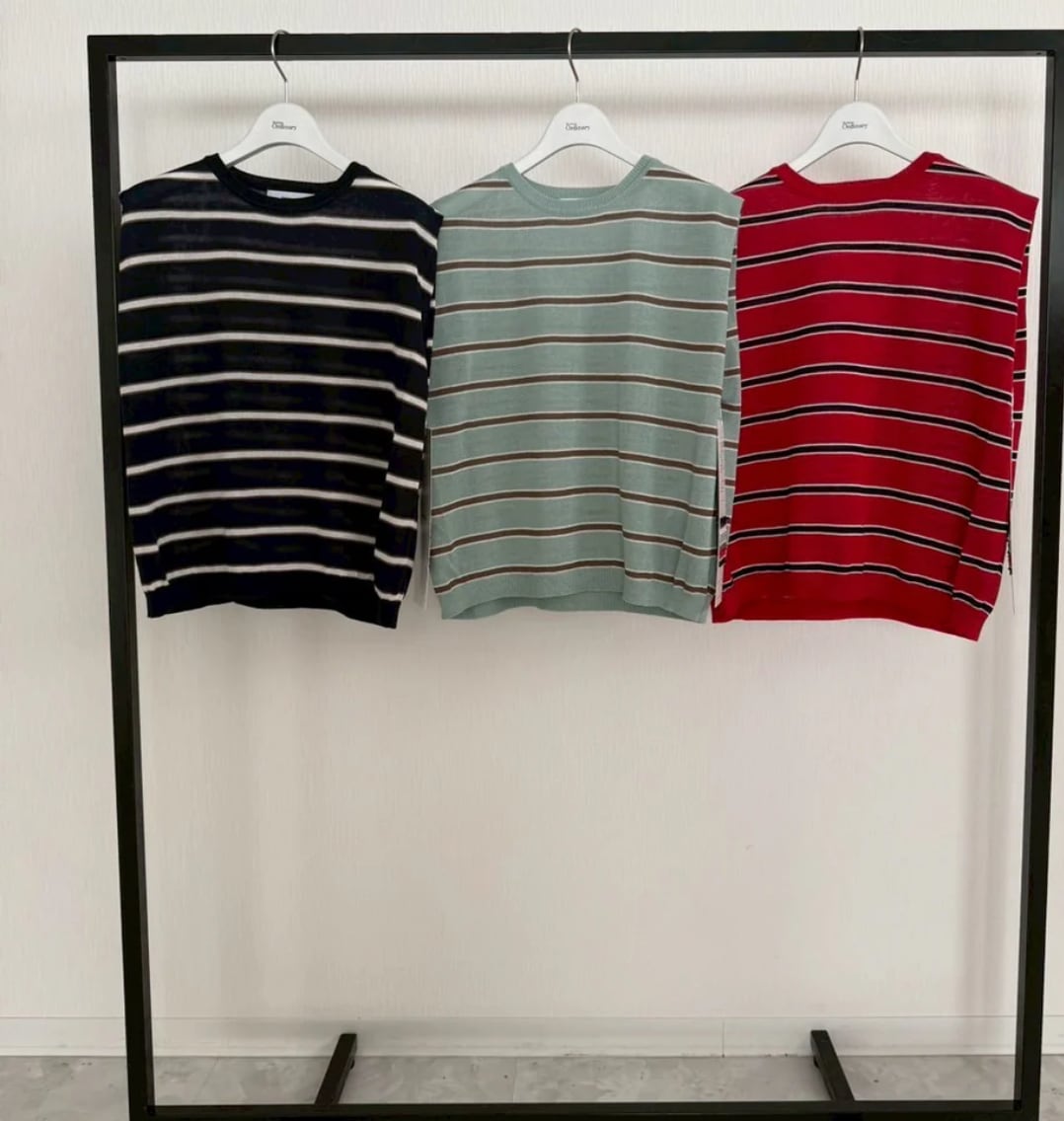 セルロース、ポリエステル、レーヨンをブレンドした12ゲージの天竺編み、シアーボーダーニットです。