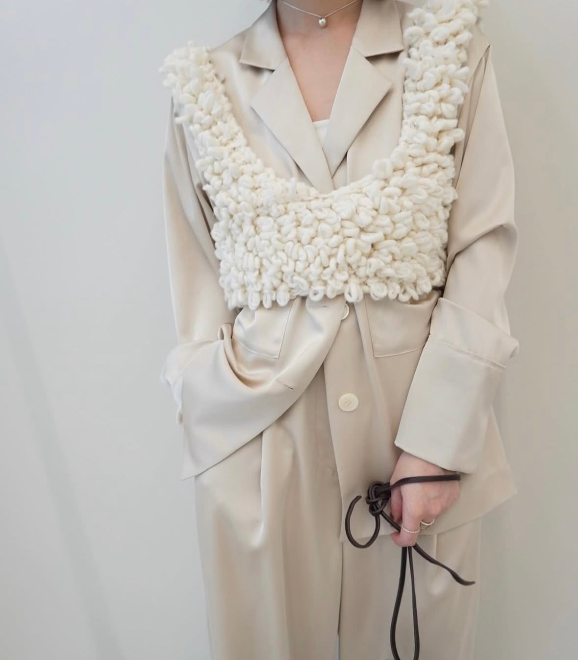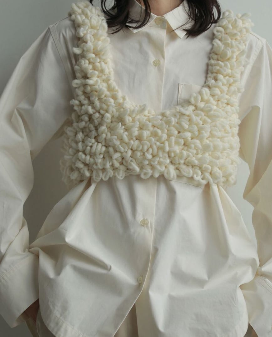 バルキーヤーンで仕上げたボリュームたっぷりのループ編みニットトップス。もこもことした立体的な表情が可愛い一枚。シンプルなシャツやコンパクトトップスの上に重ねるだけで、いつものコーディネートを一気に華やかにしてくれます。ジャケットの上から重ねるのも、こなれ感が出ておすすめです。