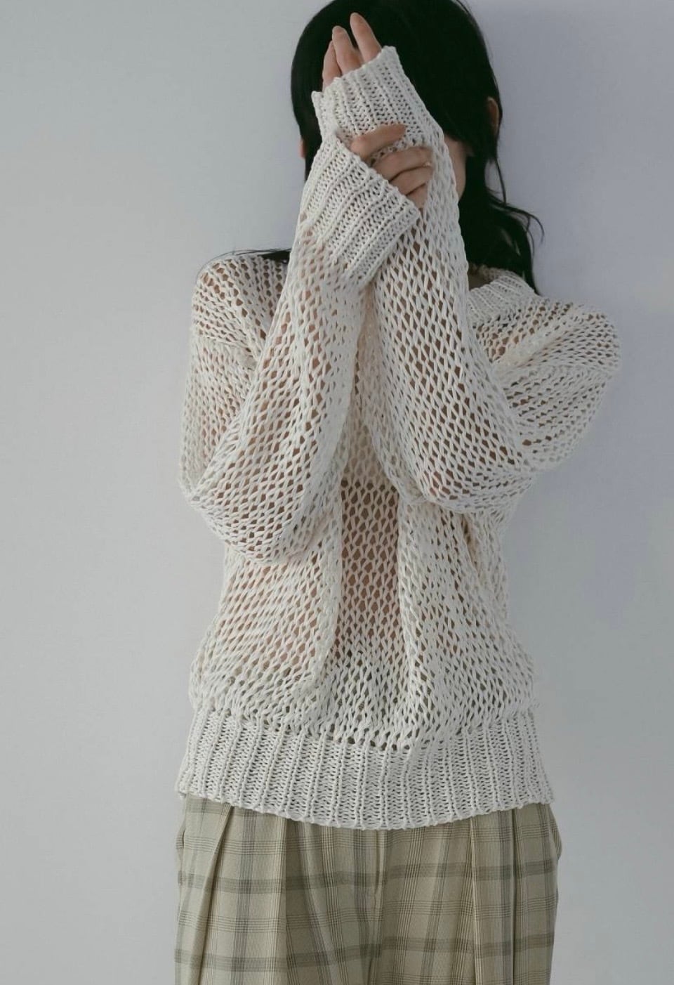 細番手の糸を並べて貼り合わせ、テープのように仕上げた糸をルーズに編み上げたオーバーニット。