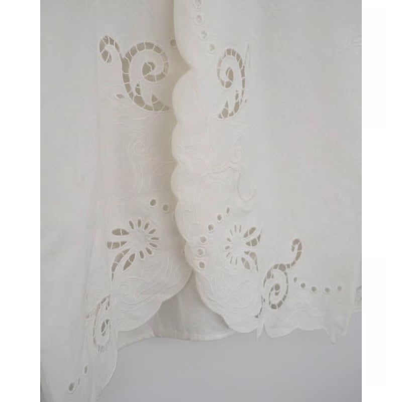スカラップ刺繍で仕上げた襟と裾もポイント。