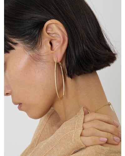 ドロップ型の大振りフープイヤリングは、前から見るとピアスをつけているようなシンプルな仕様にしています。線径の太さを箇所によって少しずつ変えているので単調になりすぎず&独特なニュアンス感が出過ぎないようにスッキリしたデザインに仕上げています。大振りなサイズなので小顔効果も◎背面内側には「CHIGNON」の刻印入り。同型ピアスもご用意いたしております。