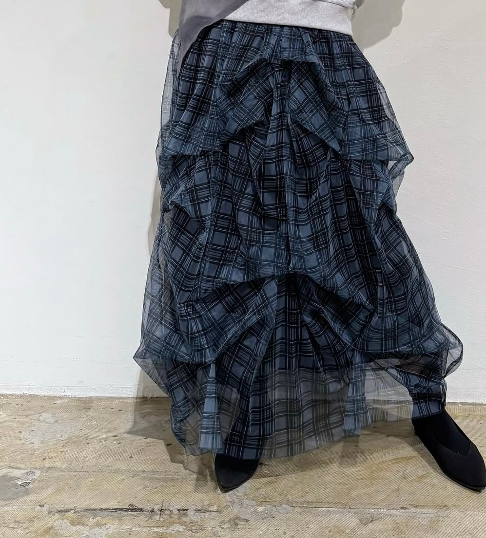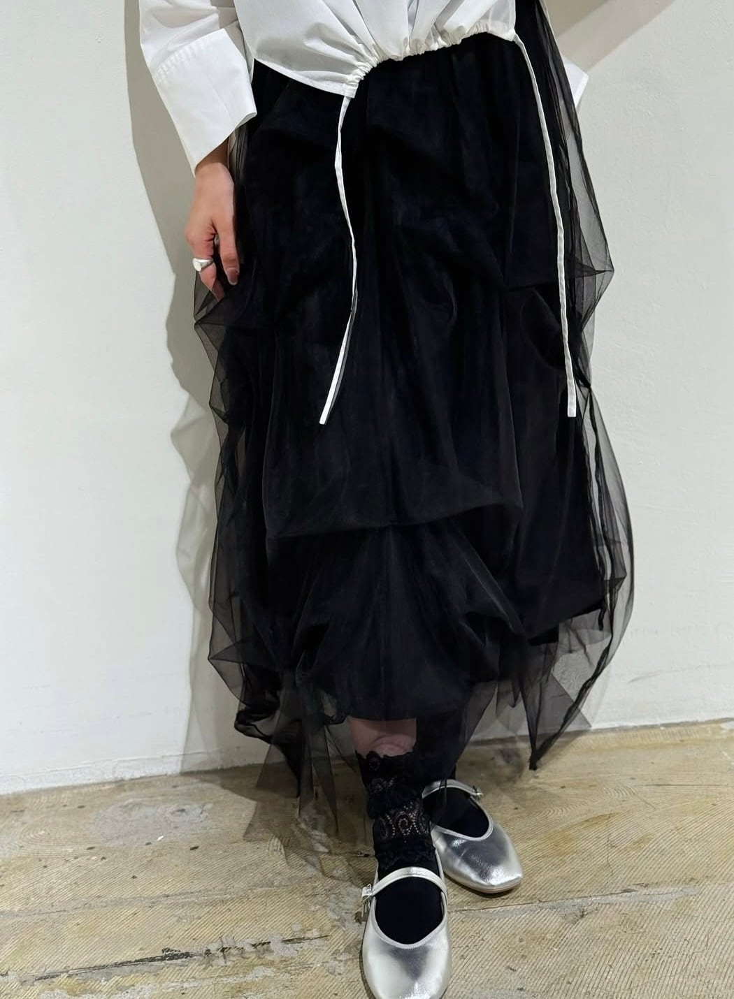 動くたびに揺れるチュール素材が、重たくなりがちな秋冬コーデに軽やかさをプラスしてくれます。
