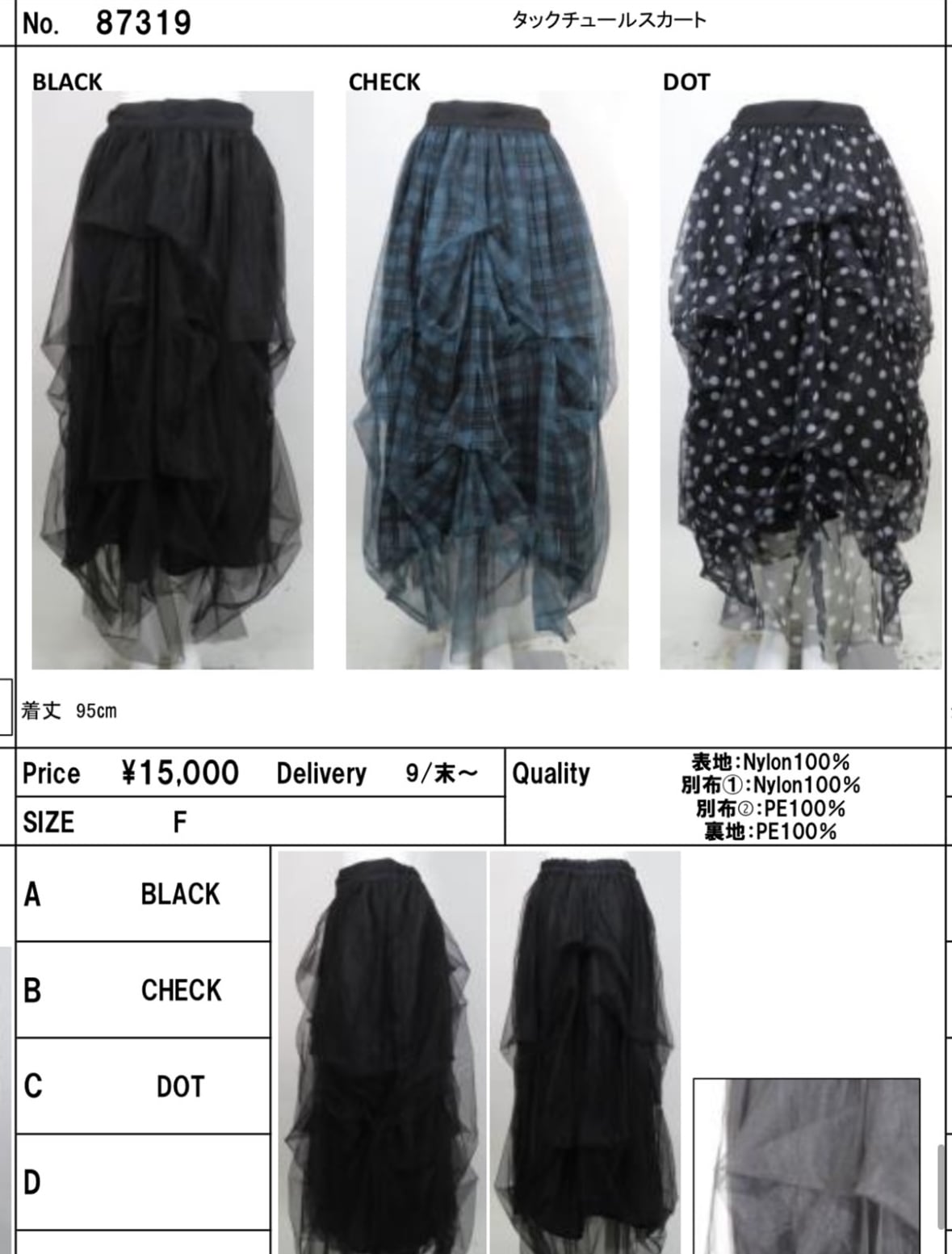繊細なチュールに色んなパターンのタックを施したスカート。