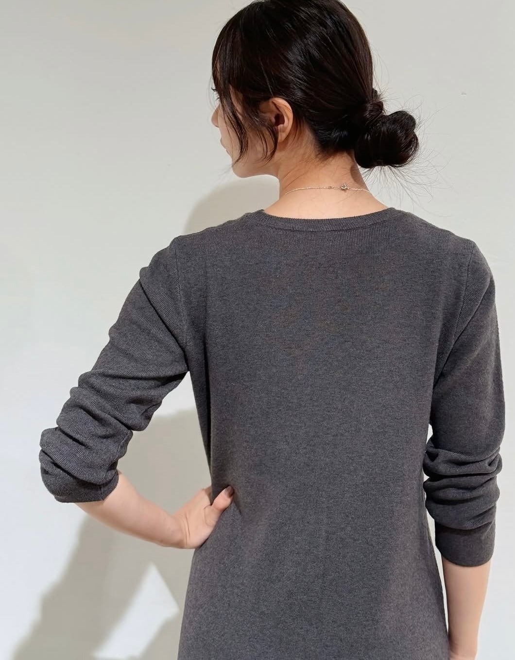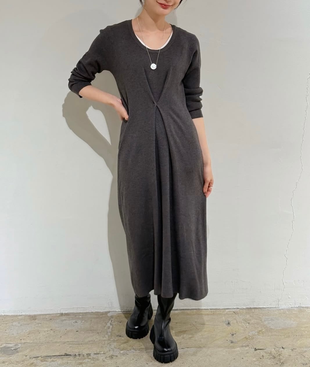 lシンプルなシルエットに、胸元のタック&ボタンディテールがアクセントボディラインを拾いすぎず、