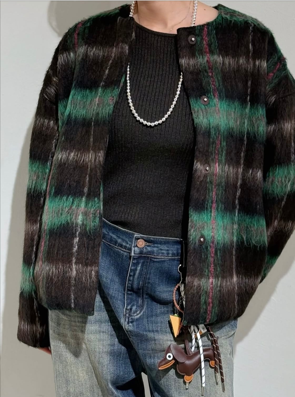 シャギー素材の柔らかな風合いと、印象的なチェック柄が存在感を放つブルゾン
