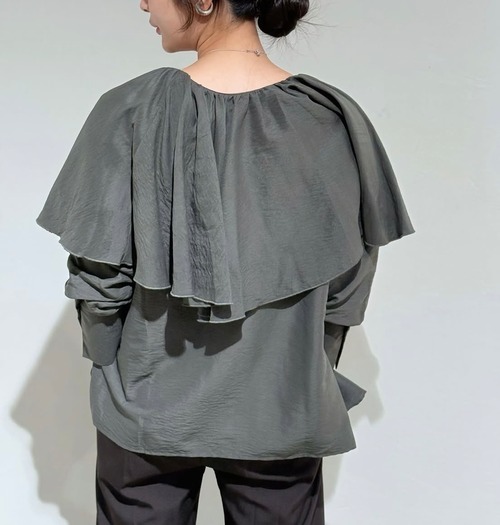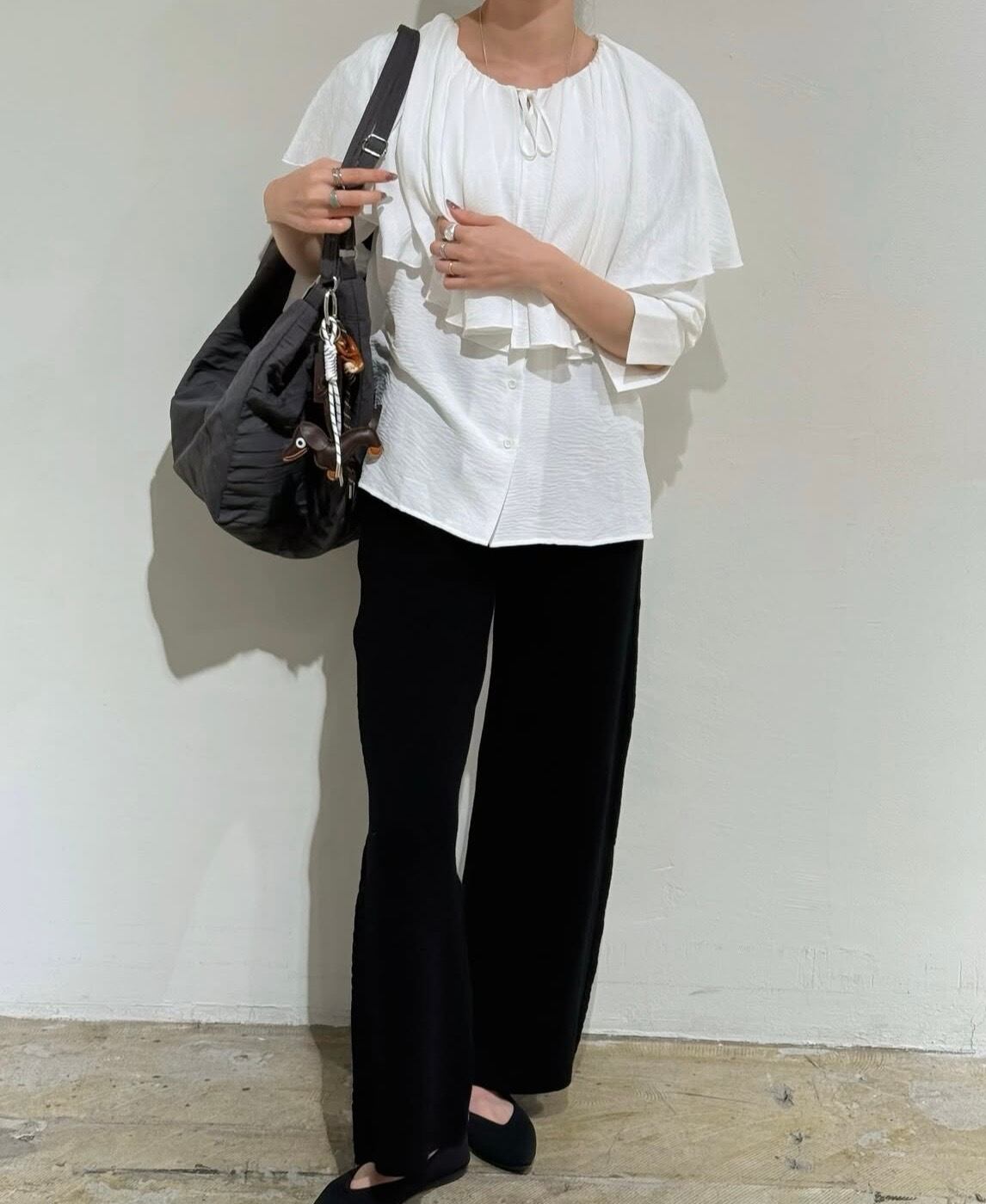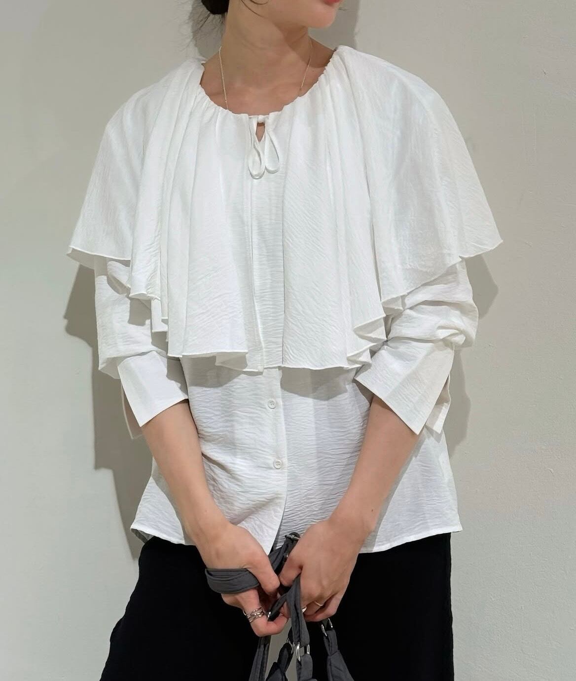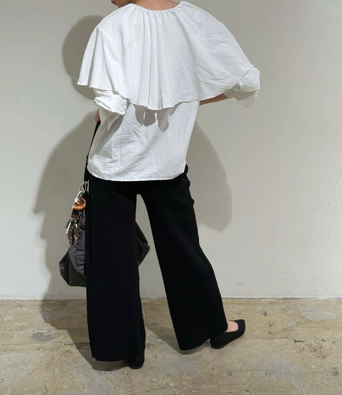 感謝祭アイテム40%オフ 感謝祭価格 ¥14300⇒¥8580 贅沢なフリルデザインが目を惹く主役級ブラウス。 後ろリボンのディテールで女性らしさをプラスし、パンツにもスカートにも合わせやすい一枚です