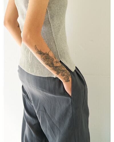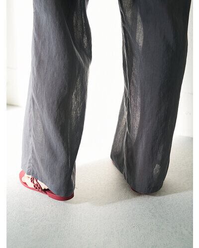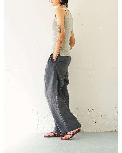 通常はブラウスで使用するような極薄の柔らかい素材をあえてパンツで採用。 真夏でもマニッシュな雰囲気のかっこよく着こなせるパンツに仕上げました。 とにかく薄くて軽いのがポイントです。 洗い加工と樹脂加工を施して、皴が多少目立たなくなるよう改良を重ねて作り上げた、シンプルながらも『こんなパンツが欲しい』ポイントを追求して作り上げました。