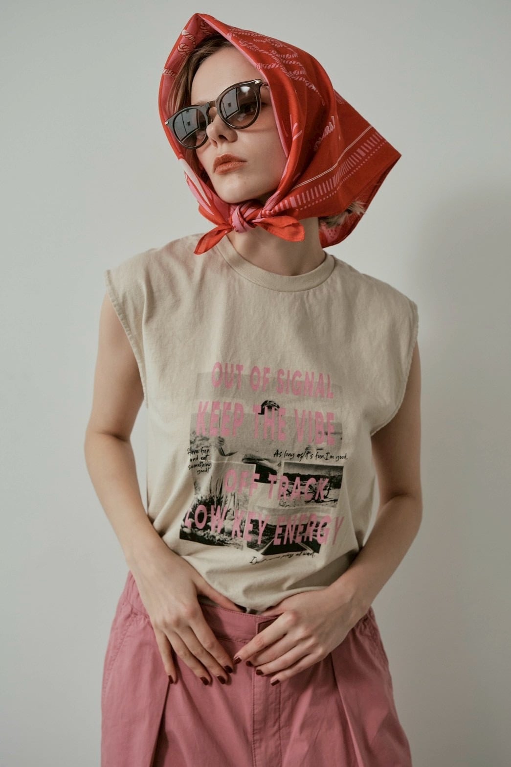 モノトーンフォトとロゴをコラージュ風にレイアウトしたプリントTee。カラーロゴがアクセント。