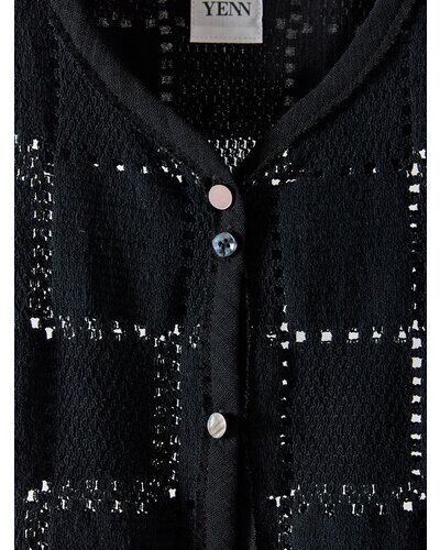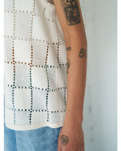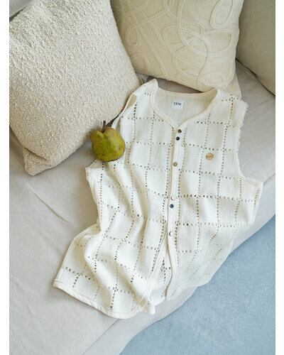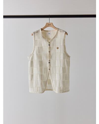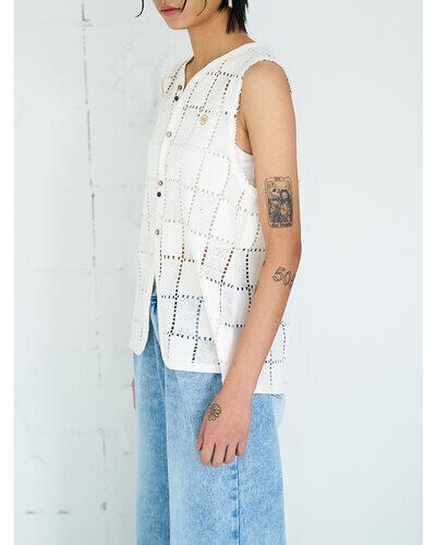マニッシュなスクエア柄レースが印象的なレーストップス。切りっぱなしのパイピングや肩部分のカットオフディテールが、程よく力の抜けたムードを演出します。ランダムに配した貝ボタンがさりげない遊び心を添え、表情に奥行きをプラス。フロント裾は前あきを斜めにカッティングすることで、ボトムと合わせた際もバランス良く、自然なスタイルアップが叶う一着です。