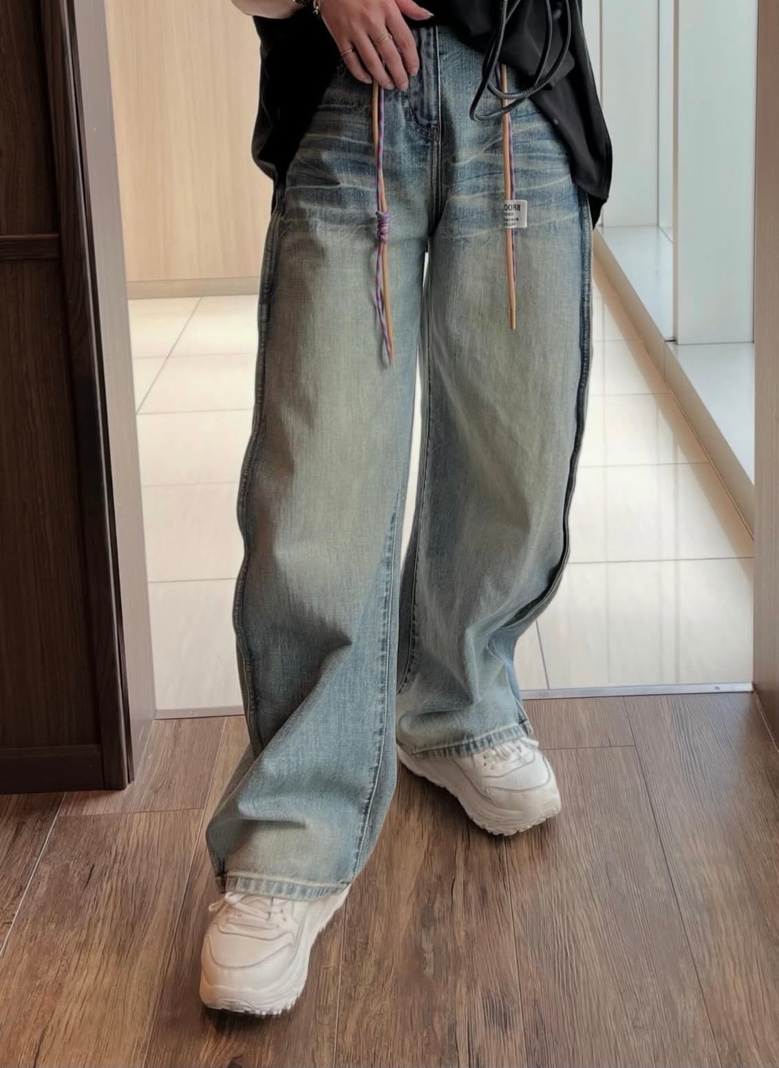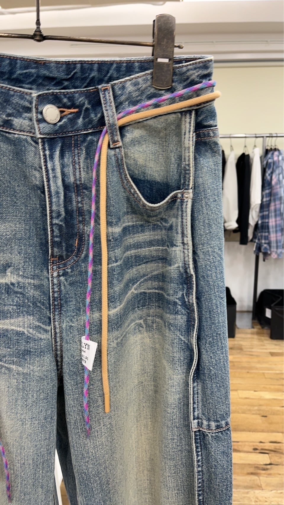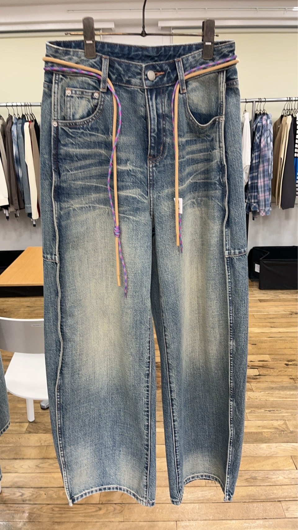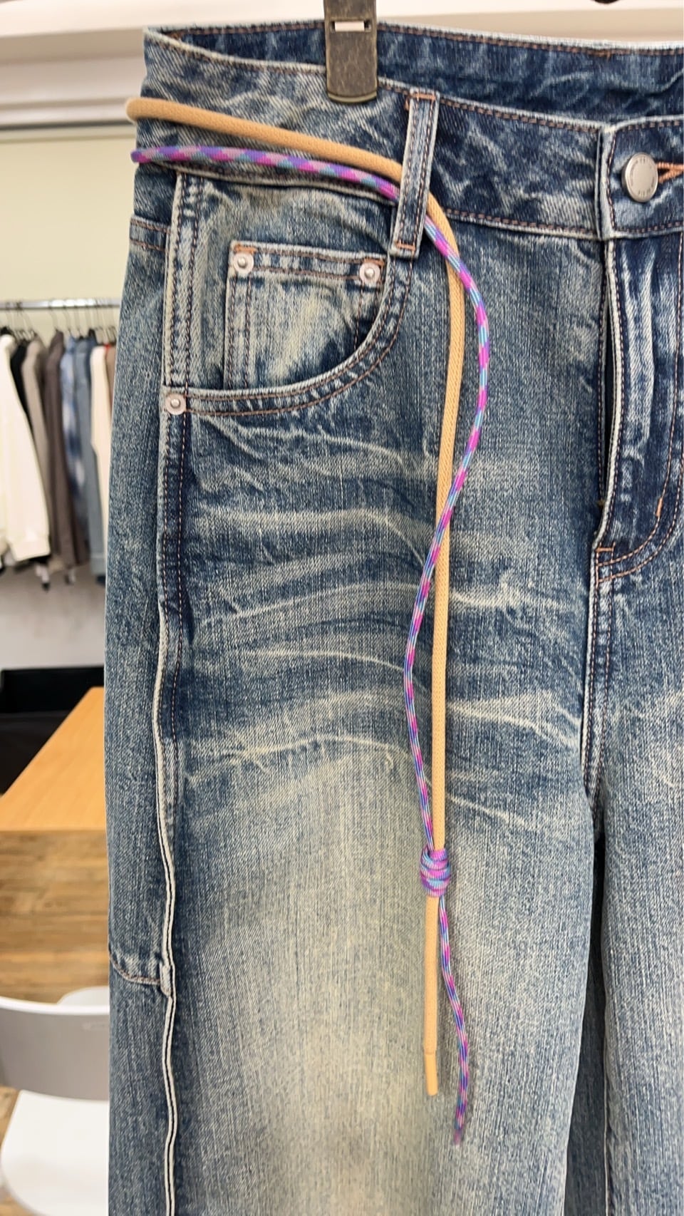 ウエストには配色コードをあしらい、ベーシックなデニムにさりげないアクセントをプラス。