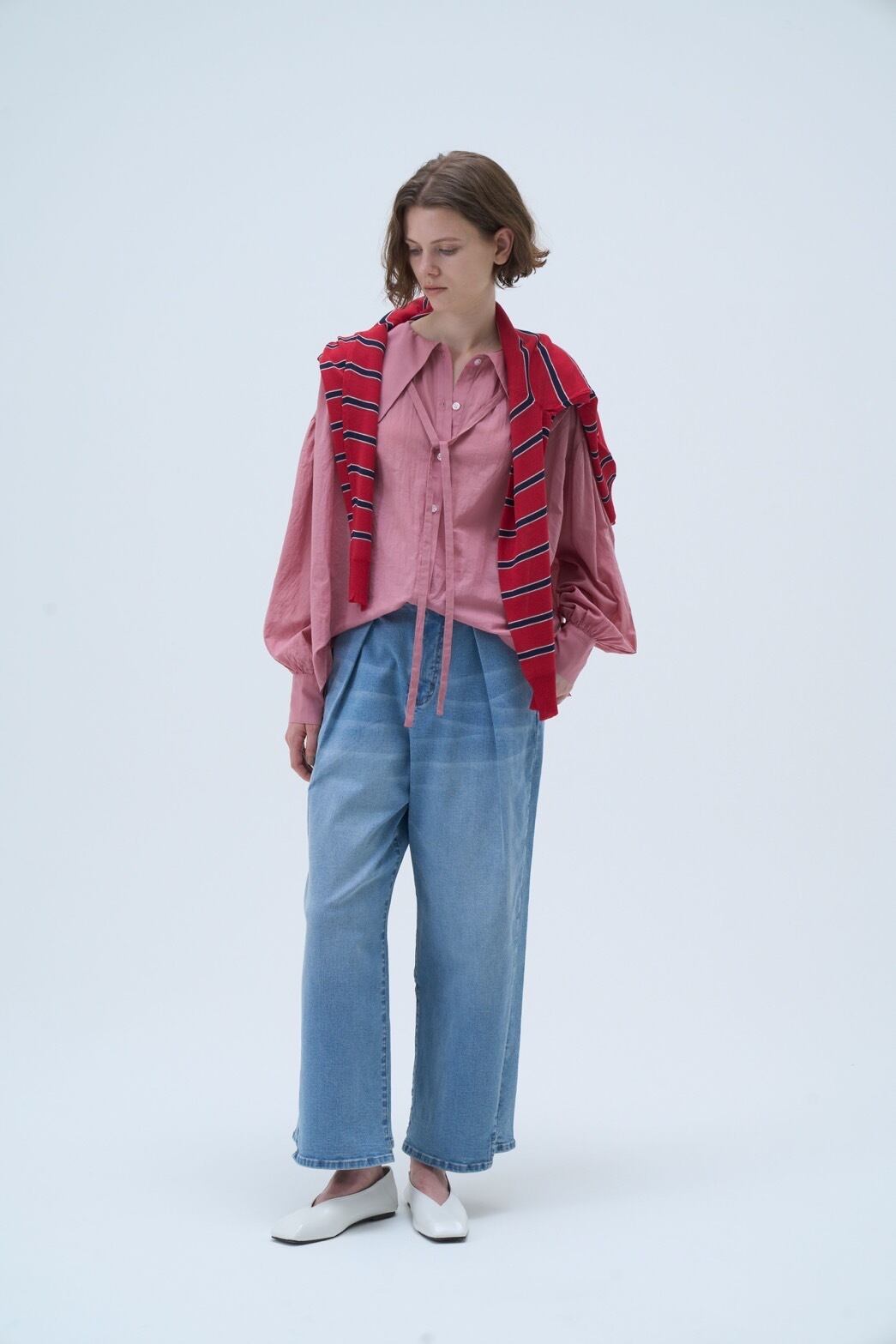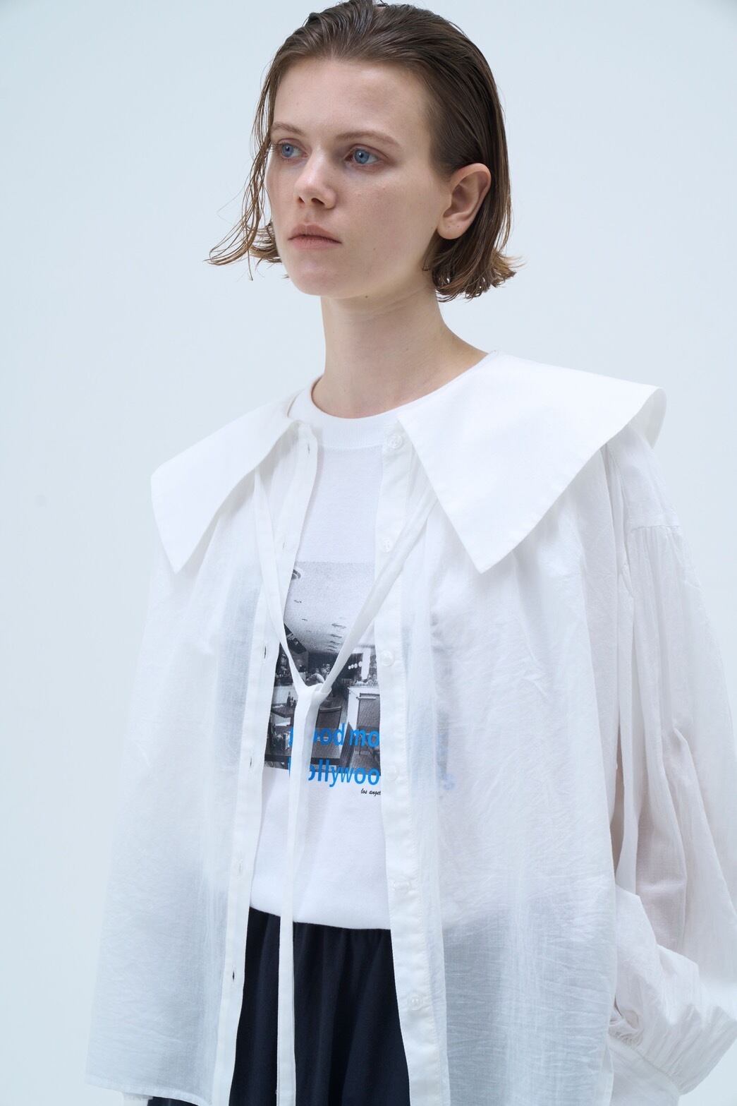 パッと目をひく大きな襟とたっぷりとしたボリューム袖がエレガントな印象のコットンボイルブラウスです