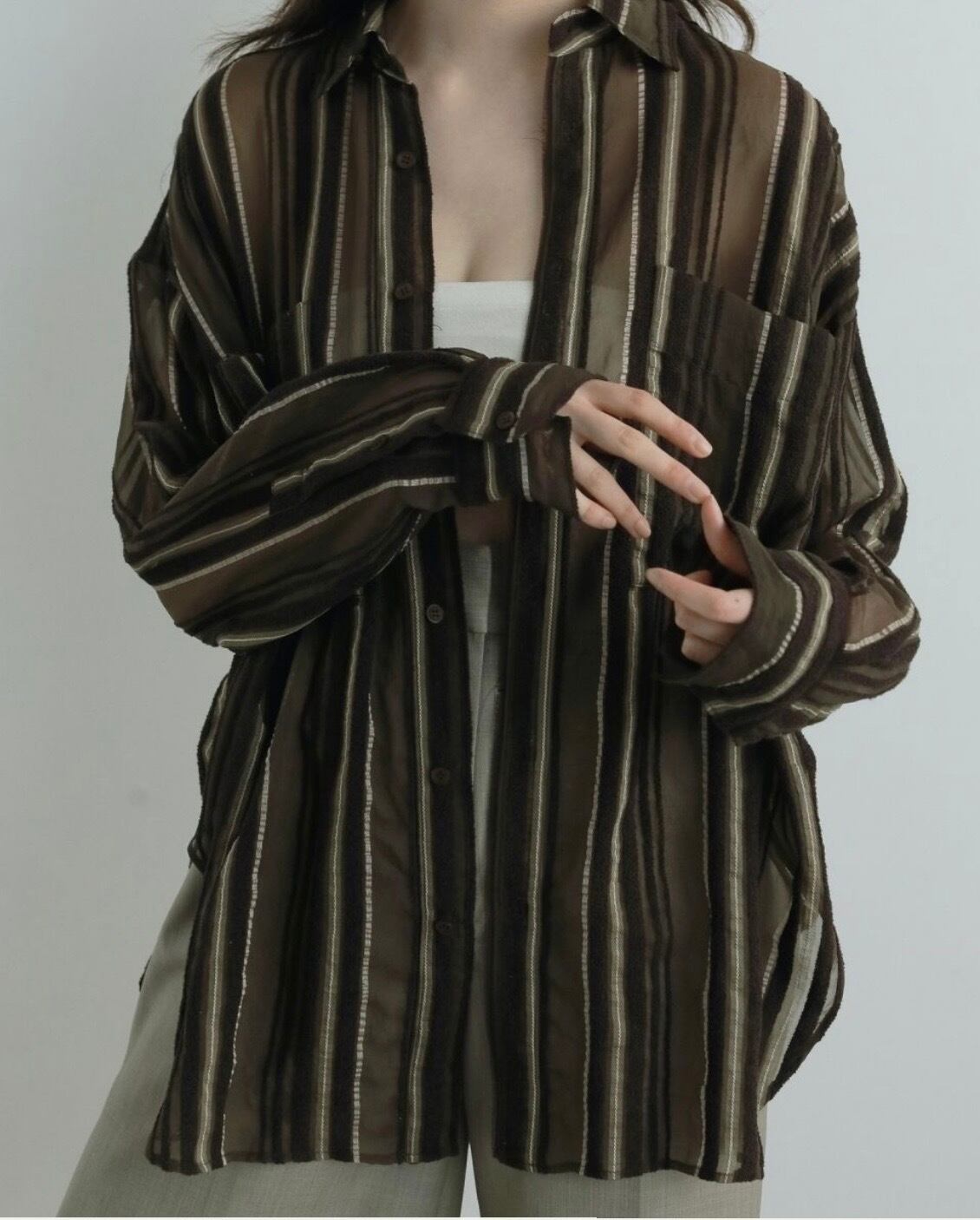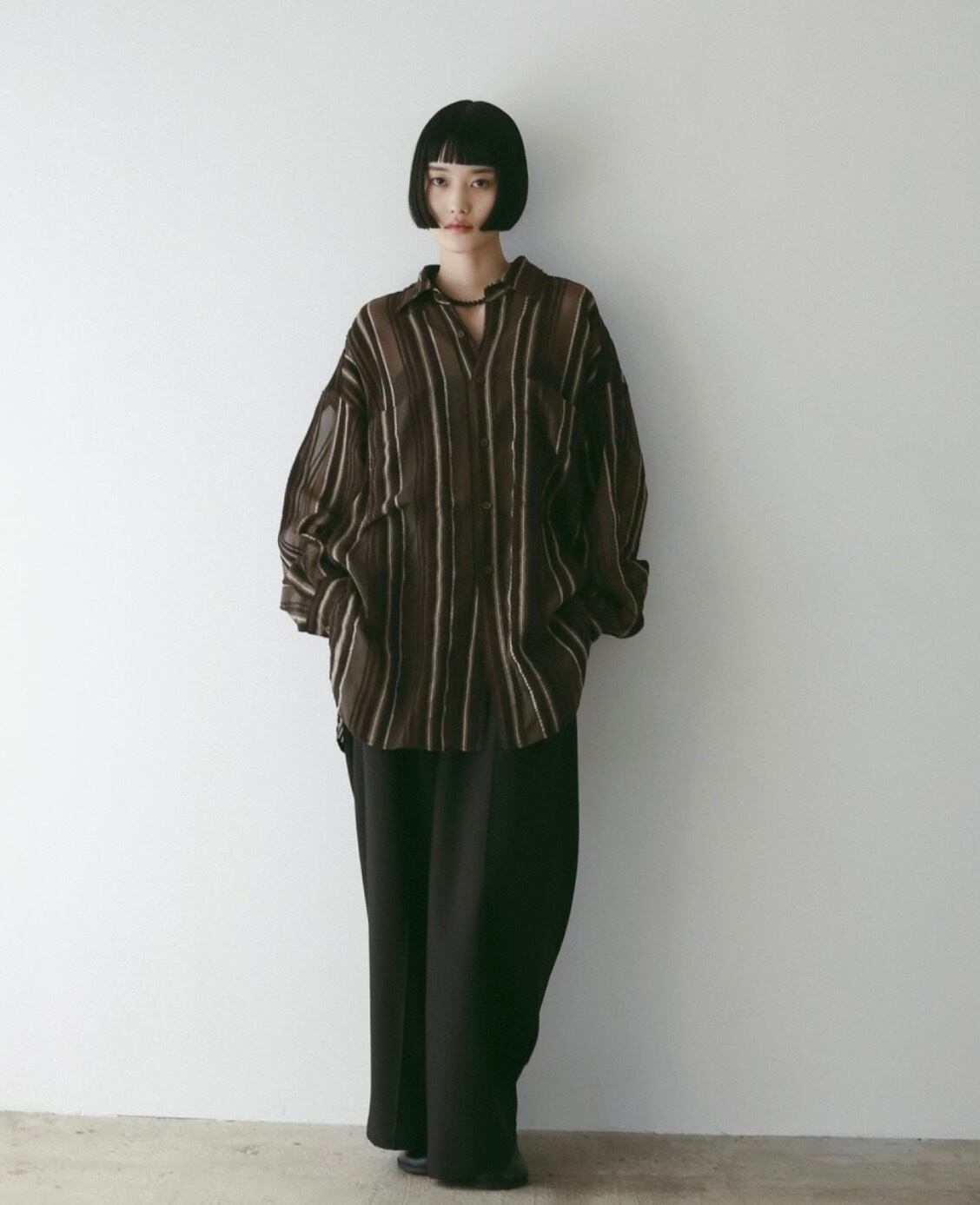 日本の桐生で織り上げたオリジナルのストライプ生地を使用したオーバーシャツ。全体はシアーに仕上げ、ライン部分はモールヤーンを使い立体的なストライプにしています。切り替え部分に、カットオフされた無地のシアー素材を挟み込んでいるのもポイント。ゆったりとしたサイジングの抜け感あるシルエットです。シンプルなボトムに合わせるだけで映える一枚です。