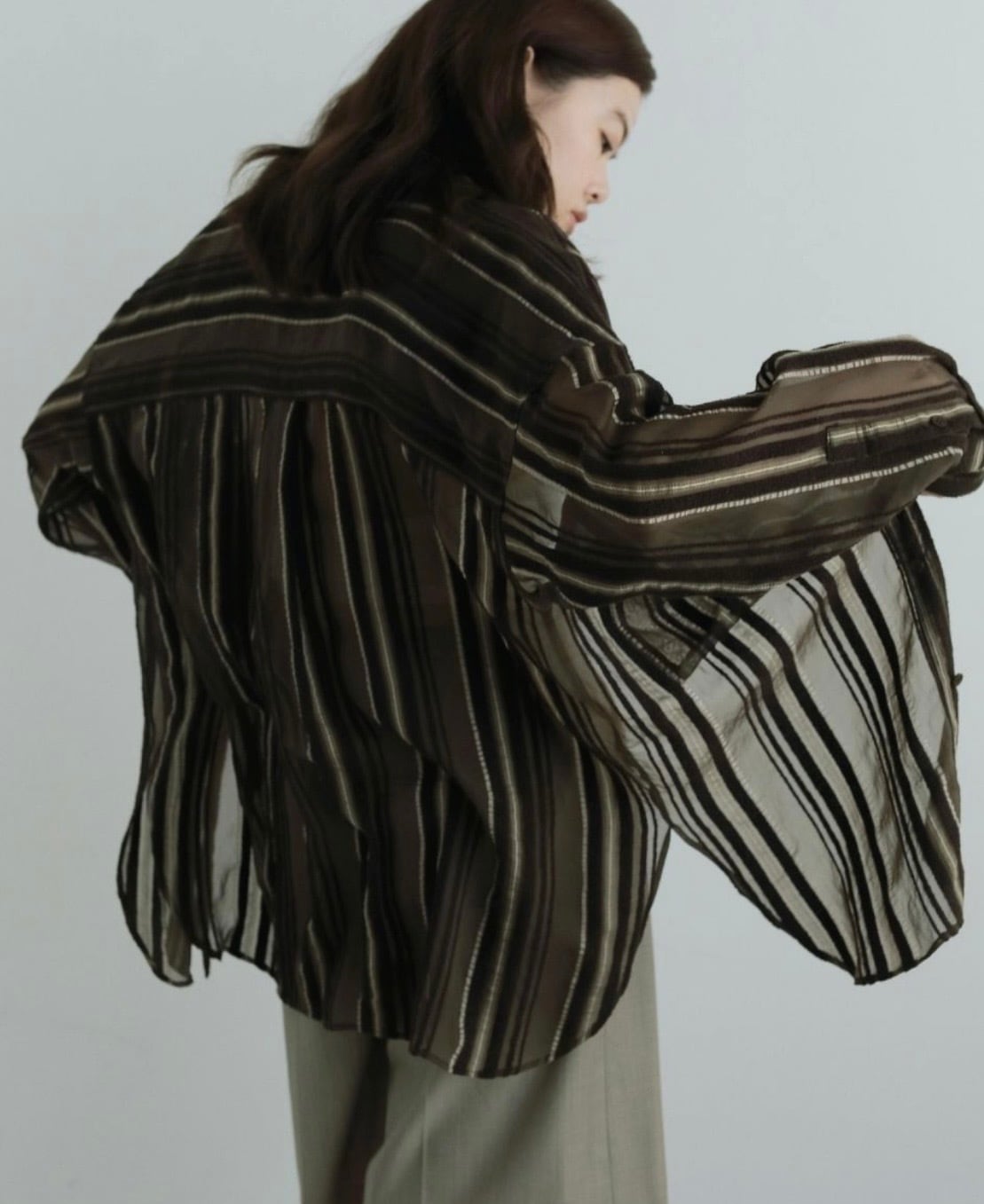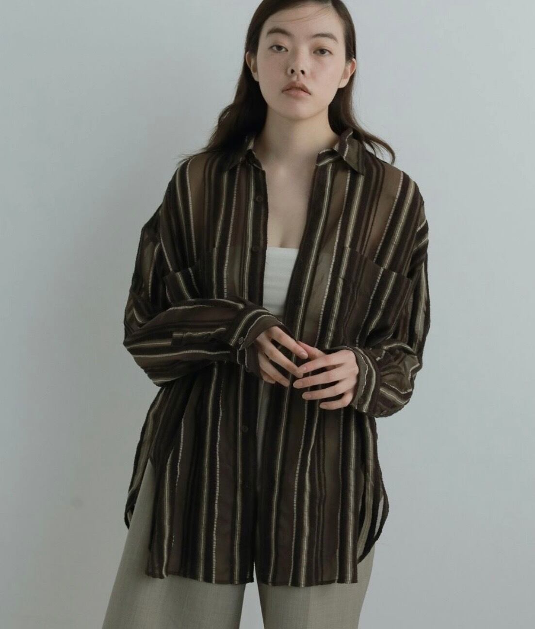 日本の桐生で織り上げたオリジナルのストライプ生地を使用したオーバーシャツ。全体はシアーに仕上げ、ライン部分はモールヤーンを使い立体的なストライプにしています。切り替え部分に、カットオフされた無地のシアー素材を挟み込んでいるのもポイント。ゆったりとしたサイジングの抜け感あるシルエットです。シンプルなボトムに合わせるだけで映える一枚です