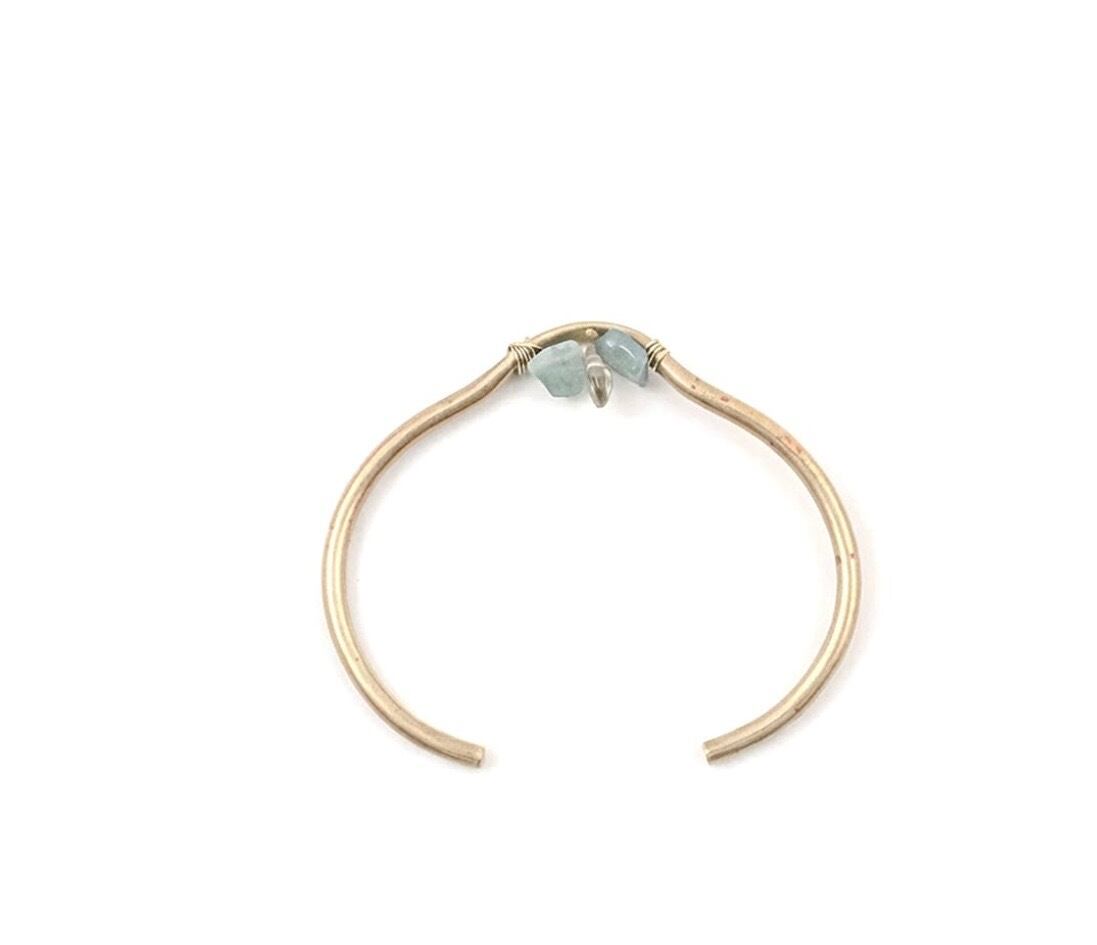 トップの天然石は、不揃いな小粒のアベンチュリンとレモンクォーツを組み合わせ真鍮線の内側に潜らせました。