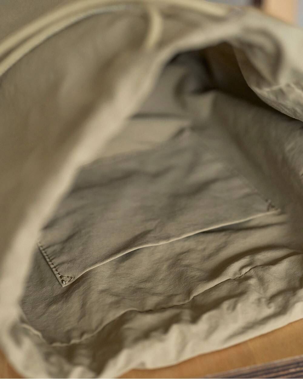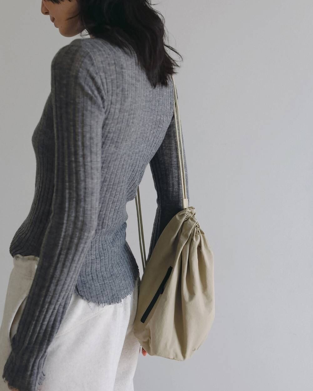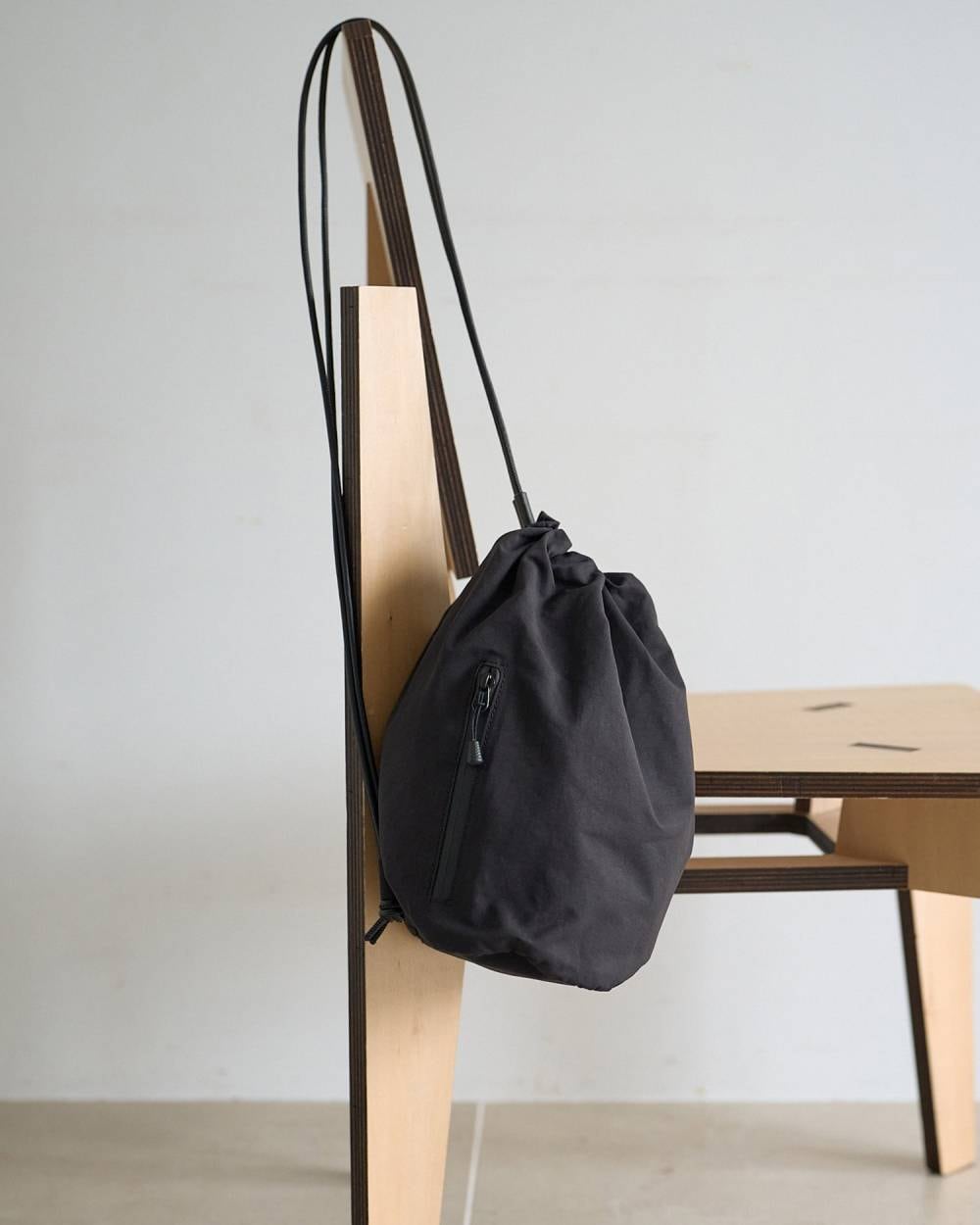 マットな質感とコンパクトなバランスで、カジュアルなナップサックをモードに引き上げます。 軽やかなナイロン素材。上を閉じたままでもスムーズに出し入れできるサイドジップには、止水ファスナーを使用。ミニマルなデザインの中に、さりげないアクセントを添えました。ベージュは配色ファスナーで程よいアクセントに。装いの外しとして、今シーズンのムードを高めます。