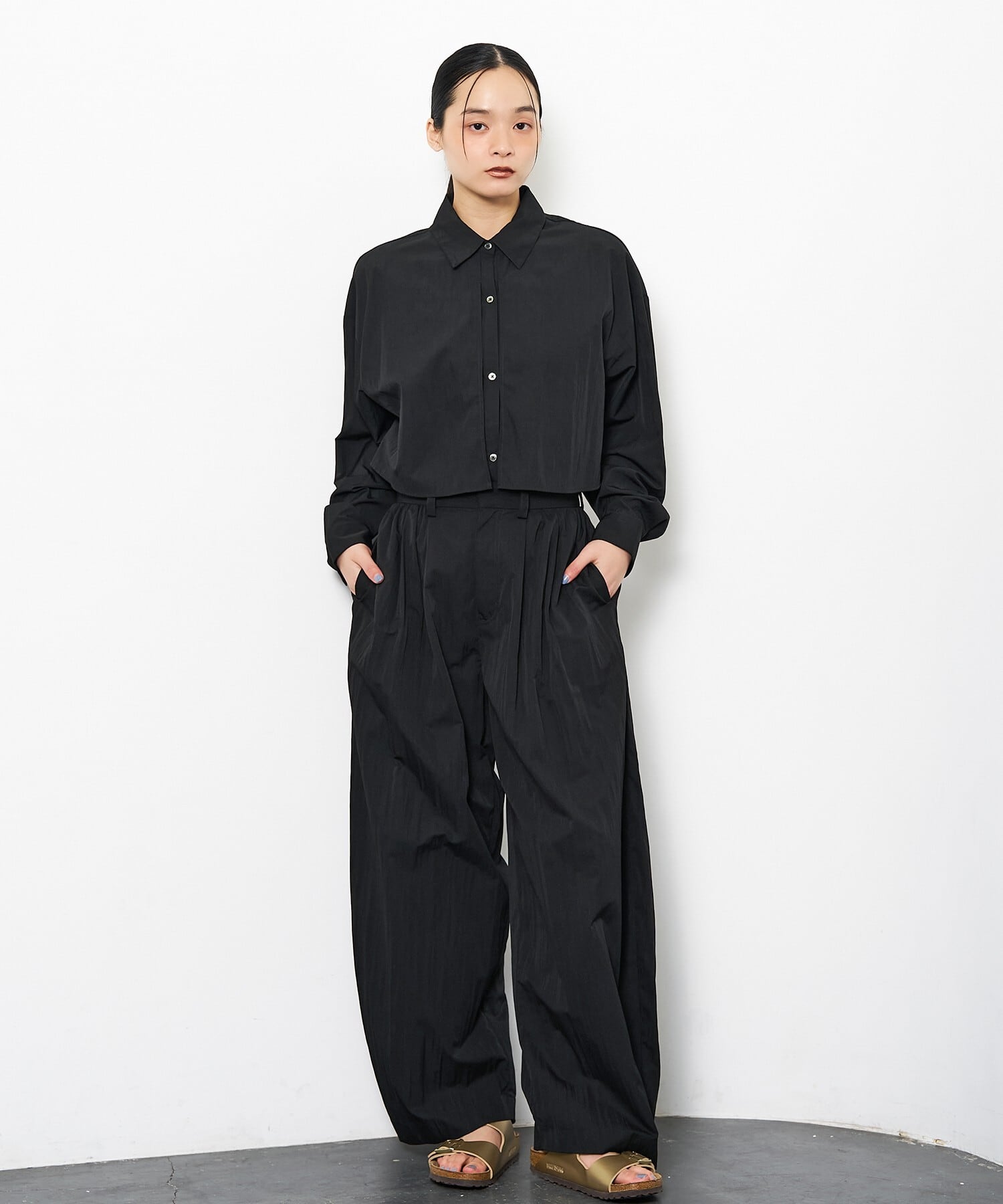 長めのヨーク(=洋服の肩や胸、背中、腰などにある切り替え部分のこと)を二重に重ねた印象的なデザインが、シンプルながらも奥行きのある着こなしを演出。