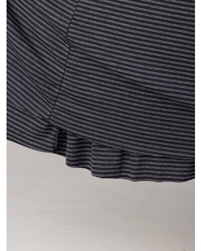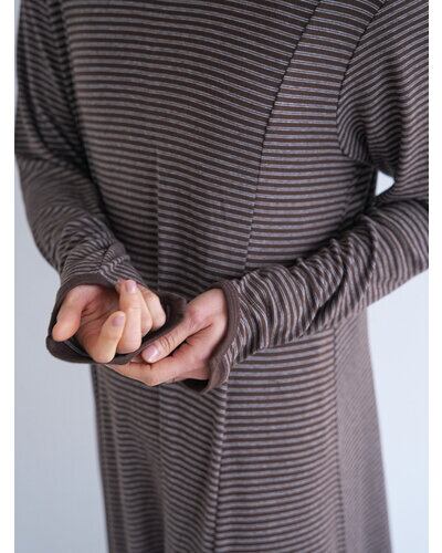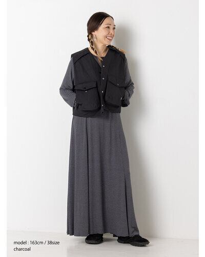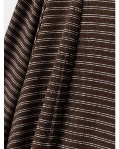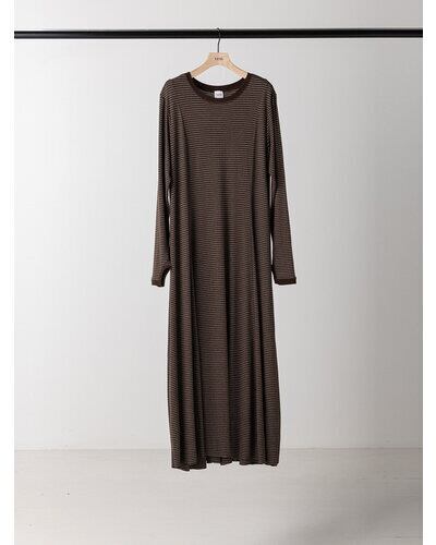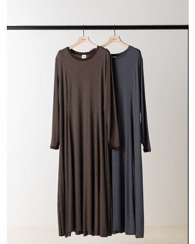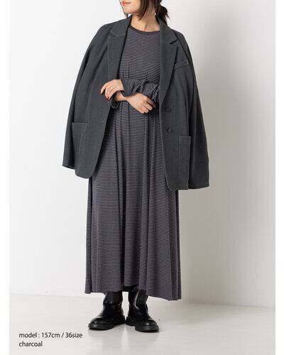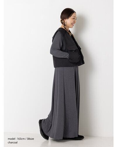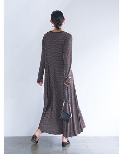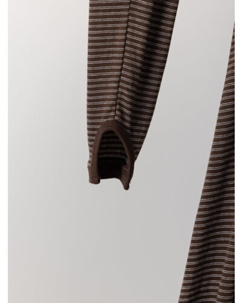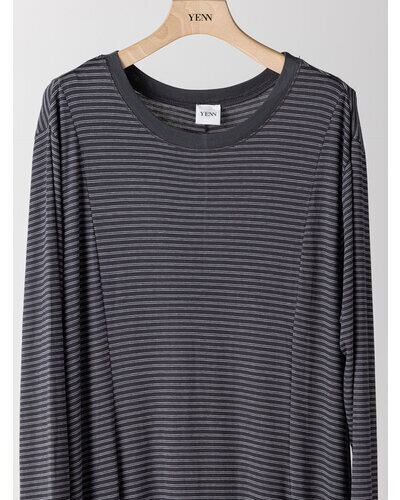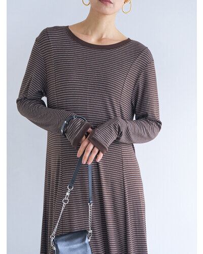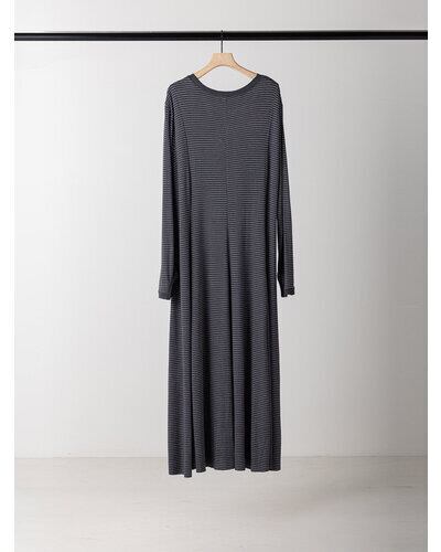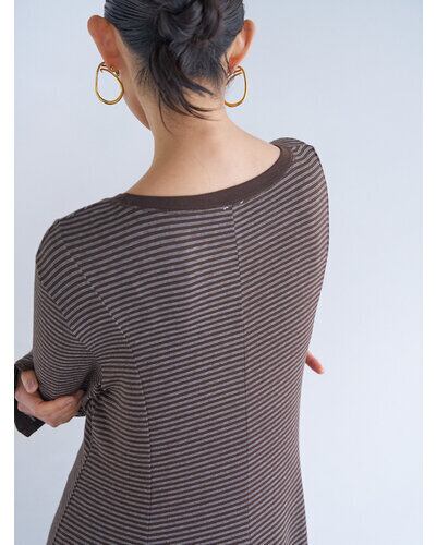 レーヨン混のやわらかな素材を使用し、身体のラインを拾いすぎず自然に整えるシルエットに。細いラインのボーダーが縦の流れを強調し、すっきりとした印象を与えます。
