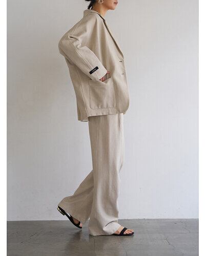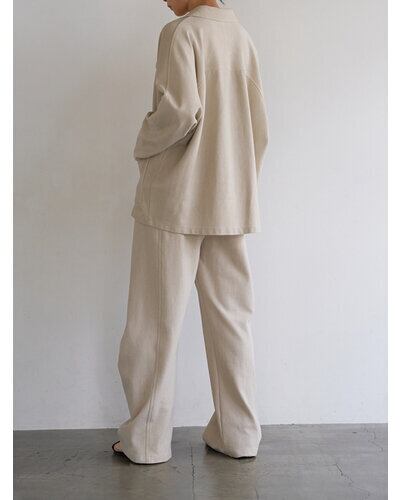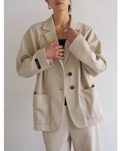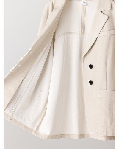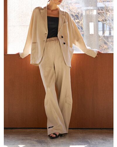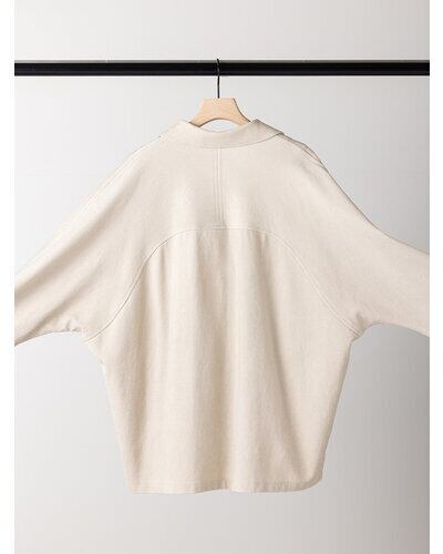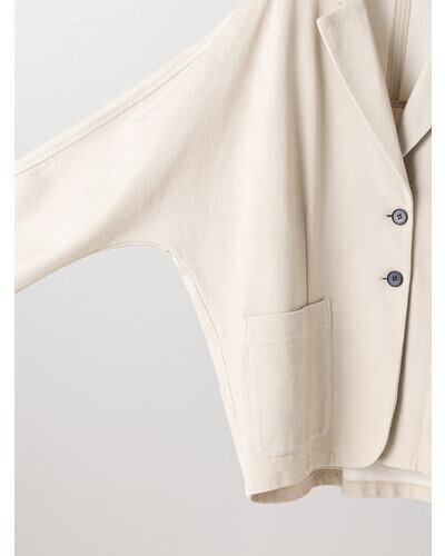 表は鹿の子組織になっていてスポーティーでさわやかな印象に。ダブル編みなので型崩れしにくく、カット素材でもきちんと感のあるジャケットに仕立てています。 製品洗いをして少し色落ちさせるフェード加工を入れることで、こなれたラフな印象をプラスしました。 オーバーサイズのドルマン袖を採用することでゆるっとした抜け感のある女性らしいシルエットに。