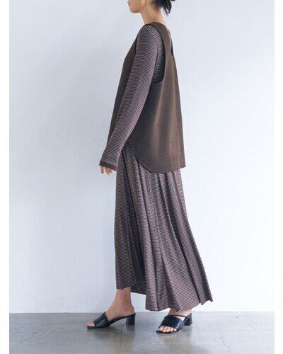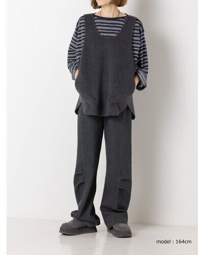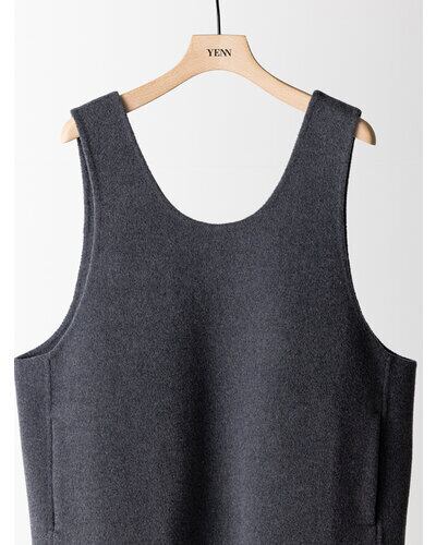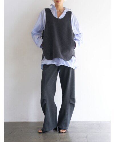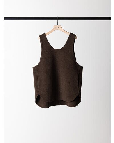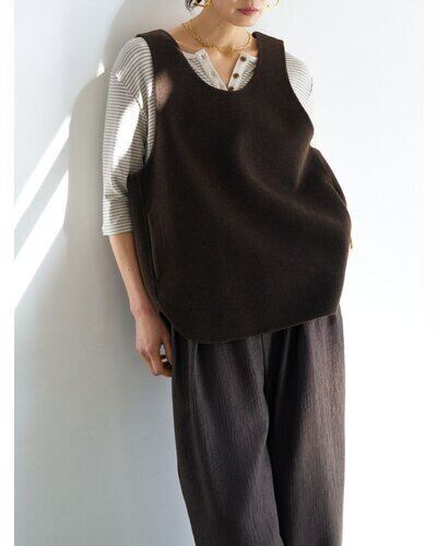 深く衿ぐりをあけたUネックデザインと大胆にあいたアームホールは中に着るものを選ばず、着脱もイージーにしていただけます。通常はコート等に使用する厚手で上質な素材を使用、ミニマルなデザインながら存在感があり、シンプルな日常のコーディネートを格上げしてくれるアイテムです。