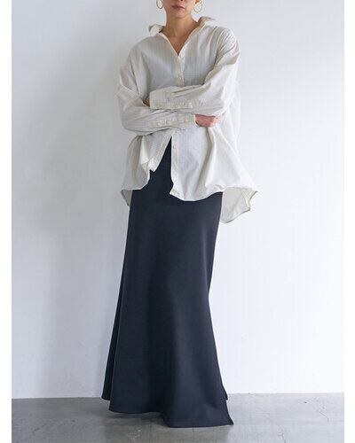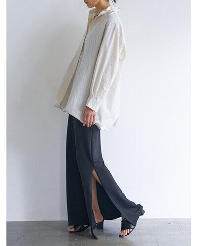 衿と裾に内蔵されたワイヤーが、美しい立ち上がりと立体感をキープ。開き具合やフォルムを自在に調整でき、その日のスタイリングや気分に合わせて表情を変えられる一枚です。程よくゆとりのあるシルエットと長めの着丈が、自然な抜け感を演出します。動きに合わせて生まれる裾のドレープも魅力です。袖口にもディテールを効かせ、さりげないアクセントをプラス。シンプルなボトムスと合わせるだけで、洗練された大人のスタイルが完成します。