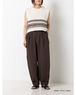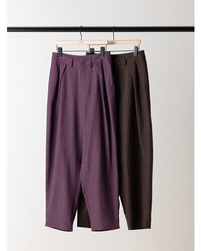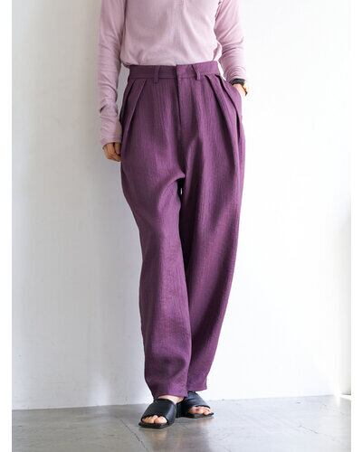 さりげない艶感と、楊柳のような縦畝が特徴の素材を使用し、カービーなカッティングのパンツに仕上げました。軽やかで落ち感がありながら、程よいハリも兼ね備えた生地感は、まだ暑さの残る秋にも快適に着用いただけます。上品なツヤがほどよい存在感を生み、シンプルなトップスともバランスよくスタイリングできる一本です。腰まわりにはしっかりとタックを入れることで立体感を持たせ、ヒップラインをさりげなくカバー。リラックス感と美しいシルエットを両立した、大人のためのパンツです。