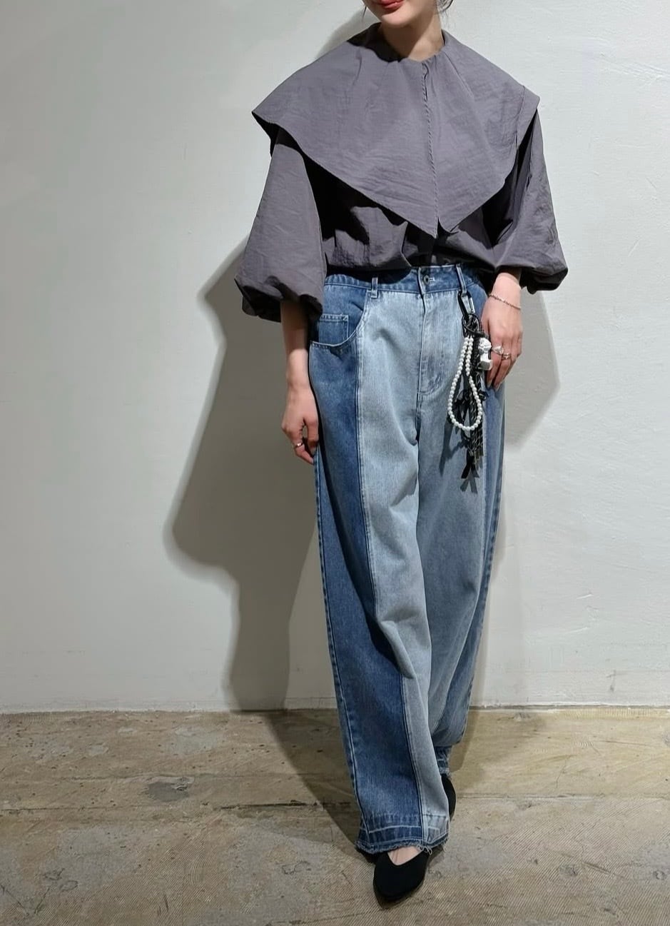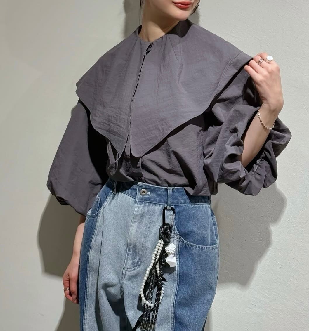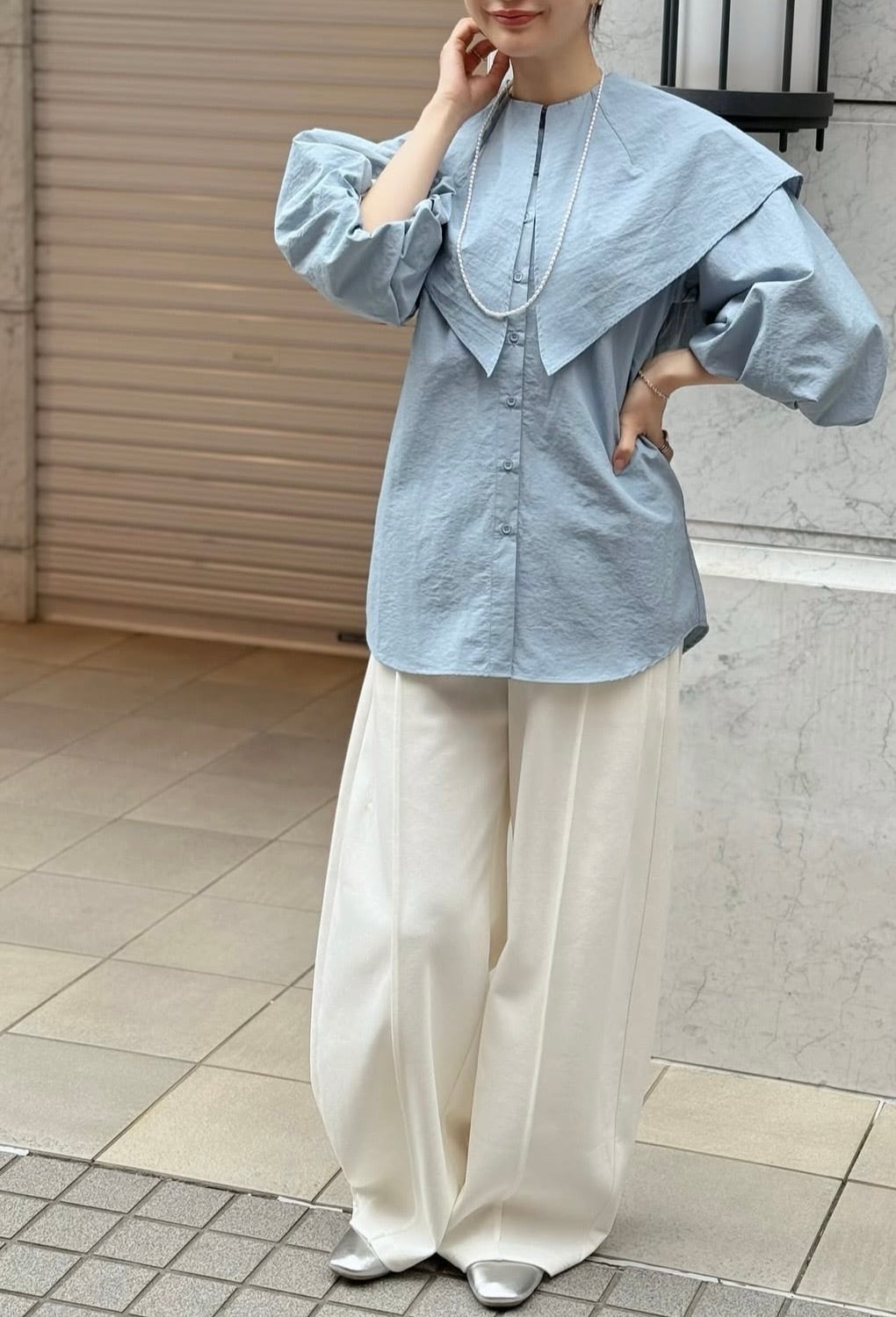 ふんわりとしたシルエットとボリュームスリーブで、女性らしい印象に。