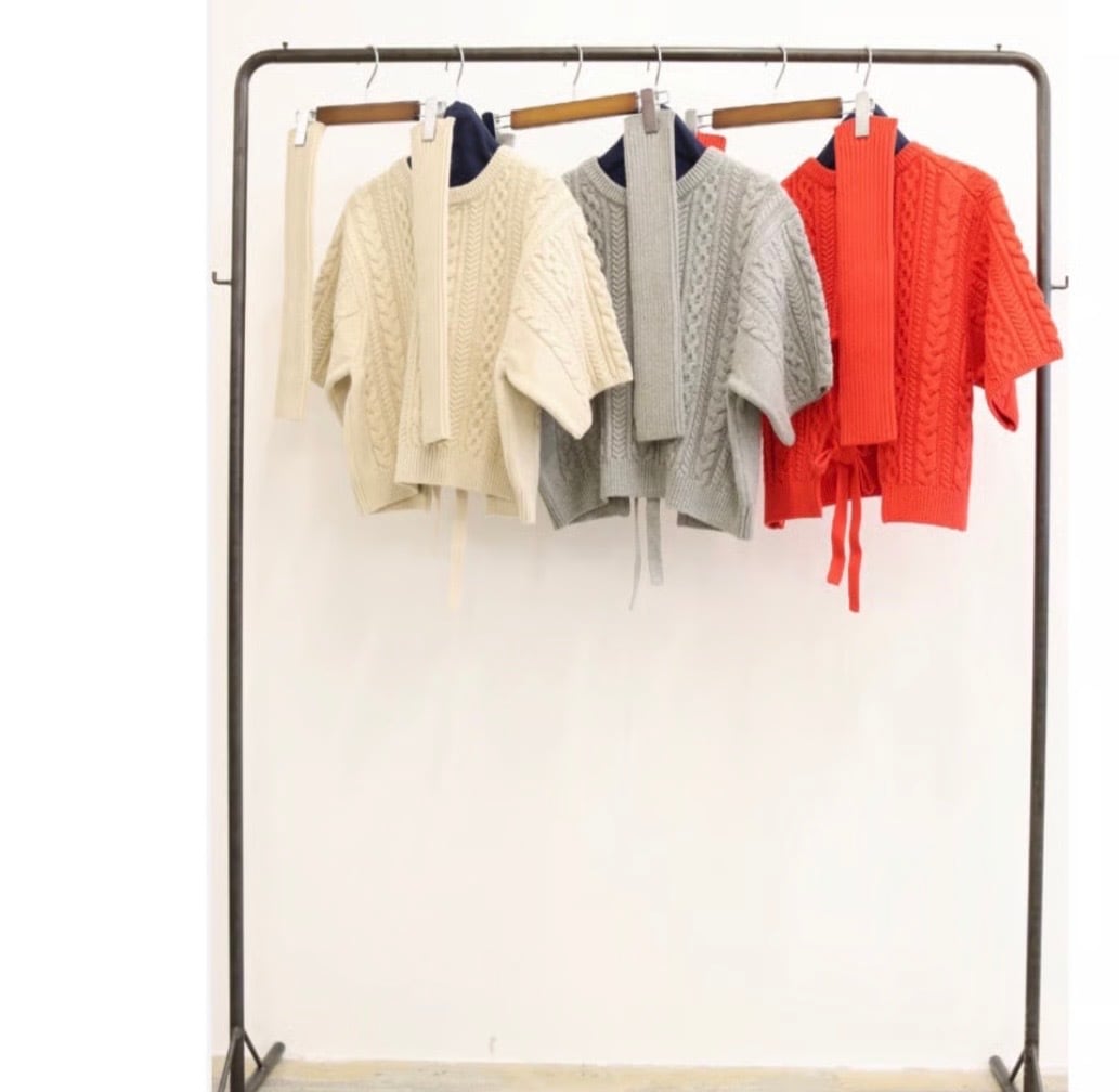太めのお袖にショート丈の身頃は丸みのある、シルエット。後ろ裾はアーチ型に開きがあり、リボンのアクセント。同素材のアームウォーマーはサムホールあり、リブ編みですっきりと、全体にバランスの良いサイジングです。