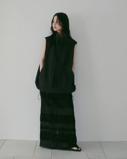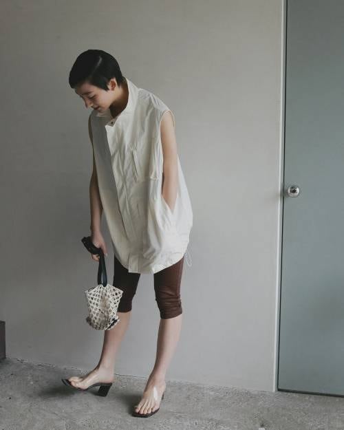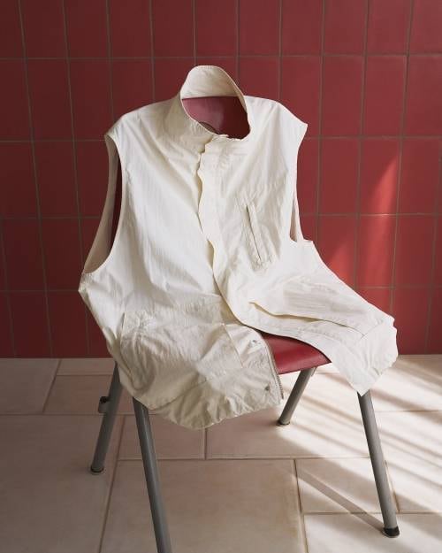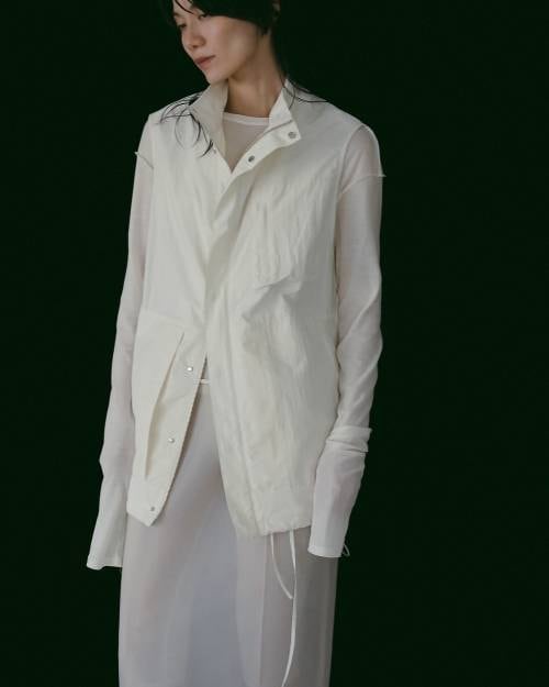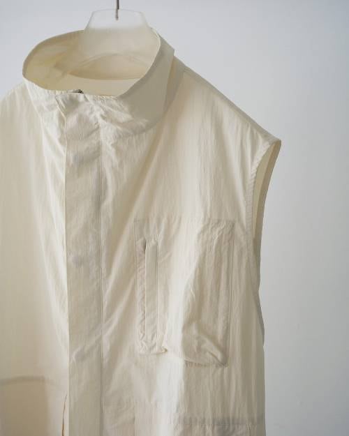 オーバーサイズでラフに仕上げたナイロンベスト。実用性も兼ね備えたZIP付きのポケットデザインが、さりげなく表情を添えながらもミニマルな印象に仕上げています。アーム周りを程よくカバーした、ノースリーブとしても取り入れやすいバランスで、裾のドローコードでシルエットを調節可能です。ワンピースやスカートなど、あえて女性らしいアイテムと合わせたスタイリングもおすすめ。コーディネートに自然な奥行きをプラスします。