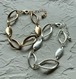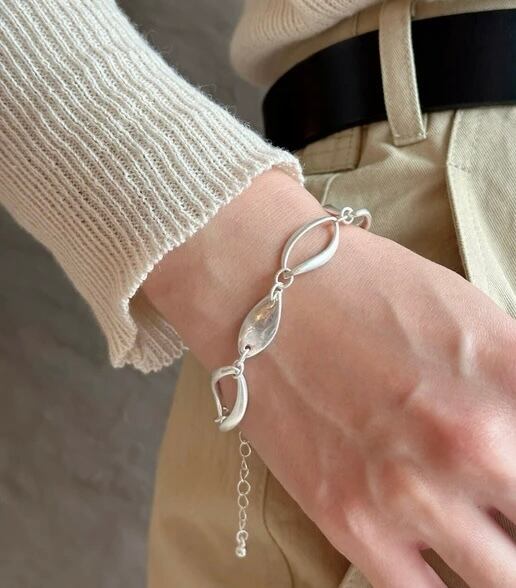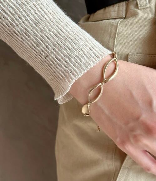 リーフ型のモチーフを挟んだチェーンブレスレット 歪みのあるモチーフなので 見る角度によって表情が変わるのも魅力。 適度なボリューム感と ツヤ消し加工のもつ特徴的な光沢が 手首回りに落ち着いた印象を与えます。 カラーはシルバー・ゴールド2色展開になります。 サイズ ・全長16cm ・アジャスター5cm ・約 8.6g 素材 合金