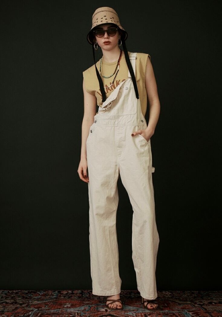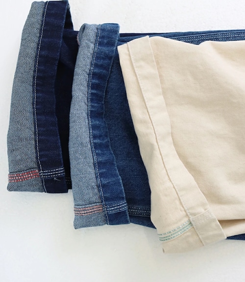 BLUEとINDIGOは10.5oz.縦スラブデニム。打ち込みは弛めで比較的馴染みが良くソフトな風合い。 IVORYはしっかりとした肉厚のツイル素材を使用。 胸当てポケットはスマホが入るサイズ設定で、さらにグラスホルダーもあり現代の生活にもマッチします